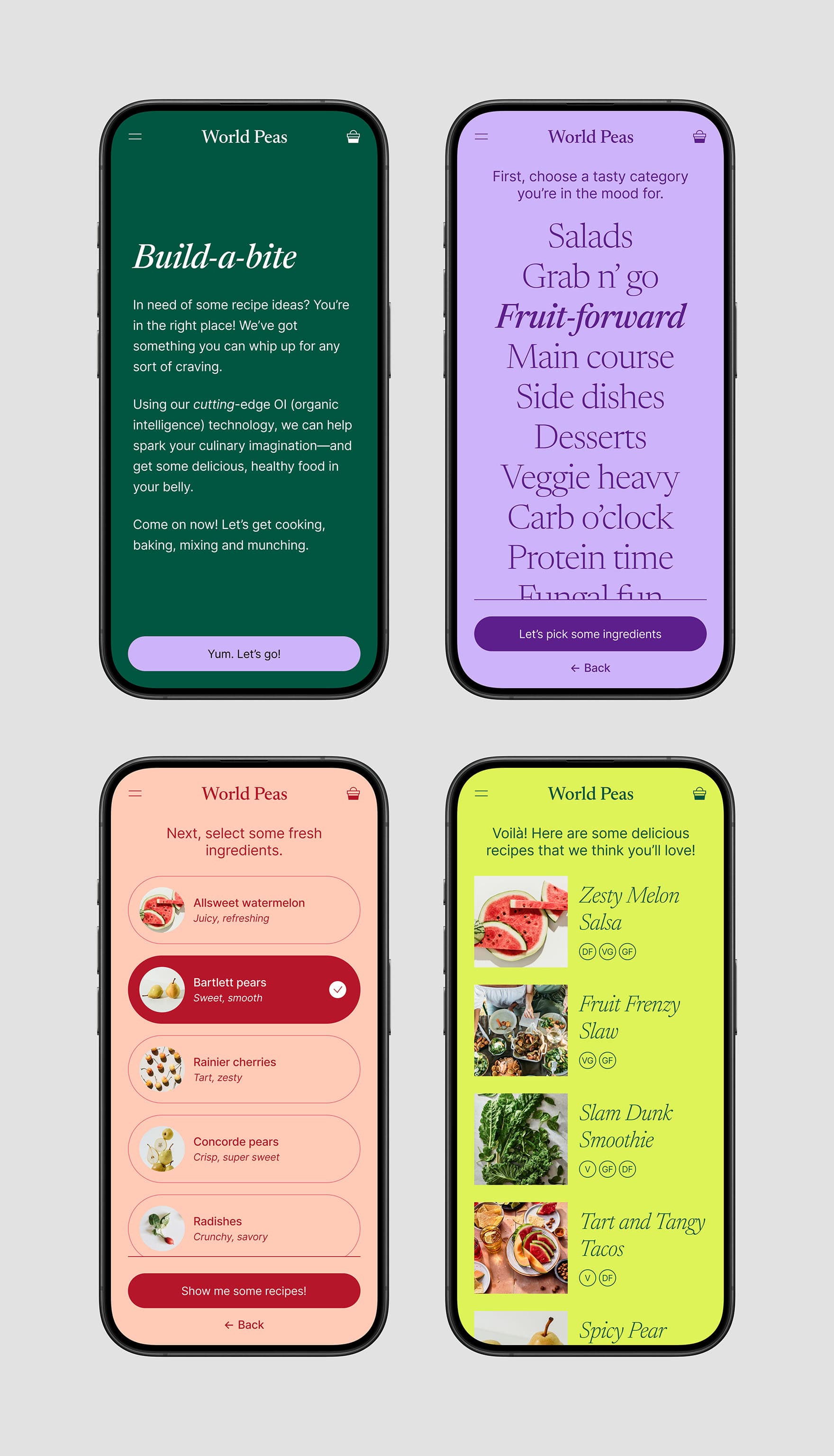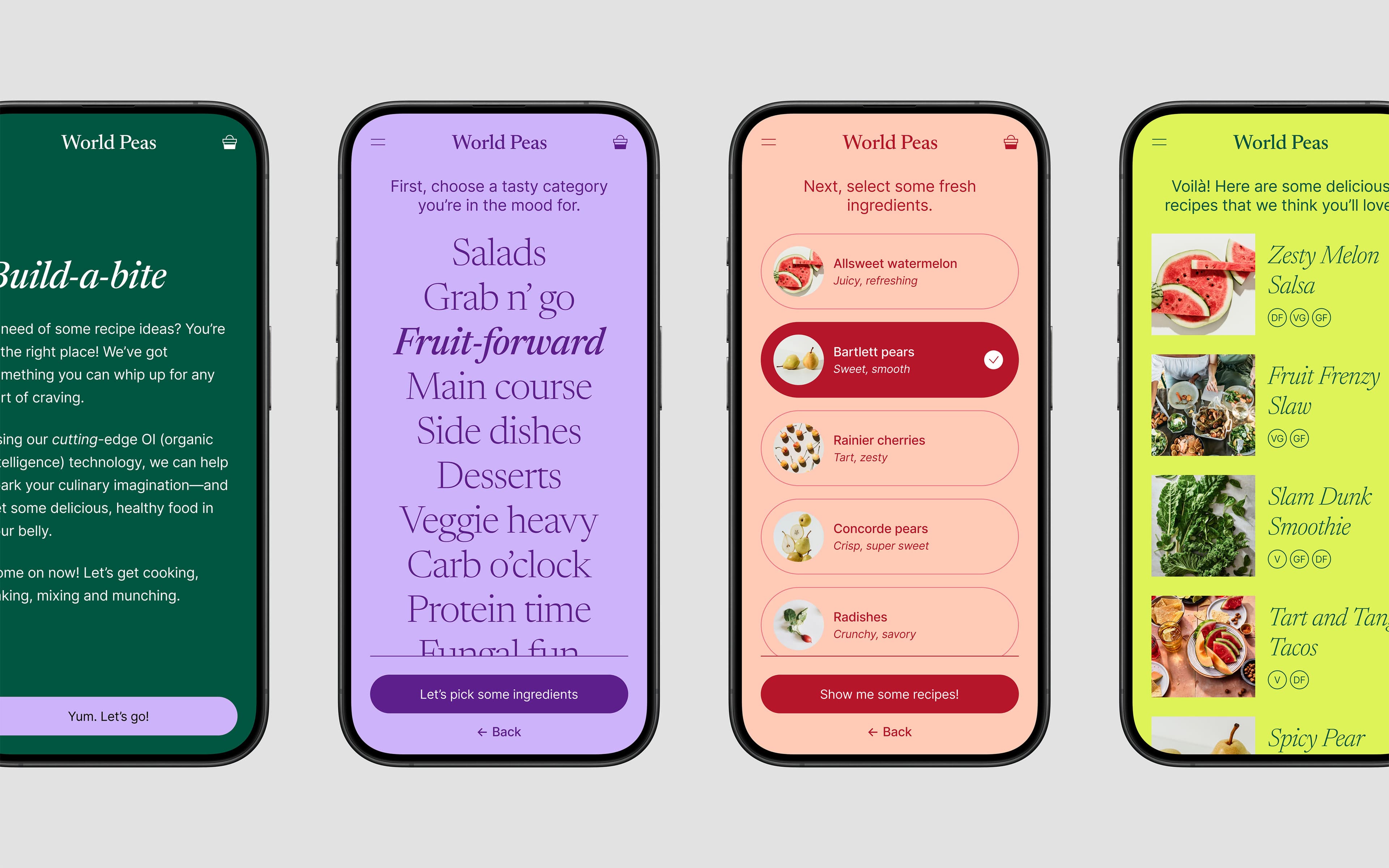 Working with design manager, Taryn Cowart, we began by revisiting World Peas, a grocery app originally conceptualized and designed by Andy Luce and the brand team.